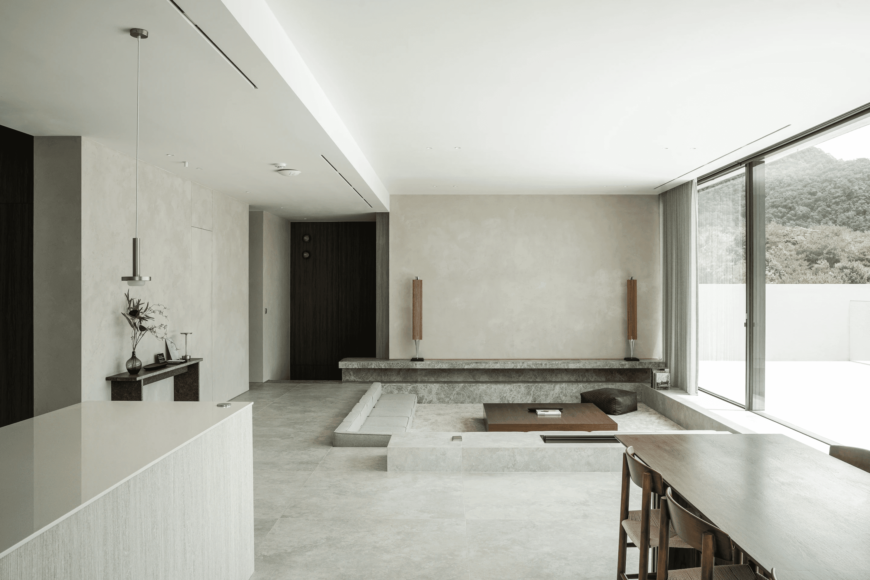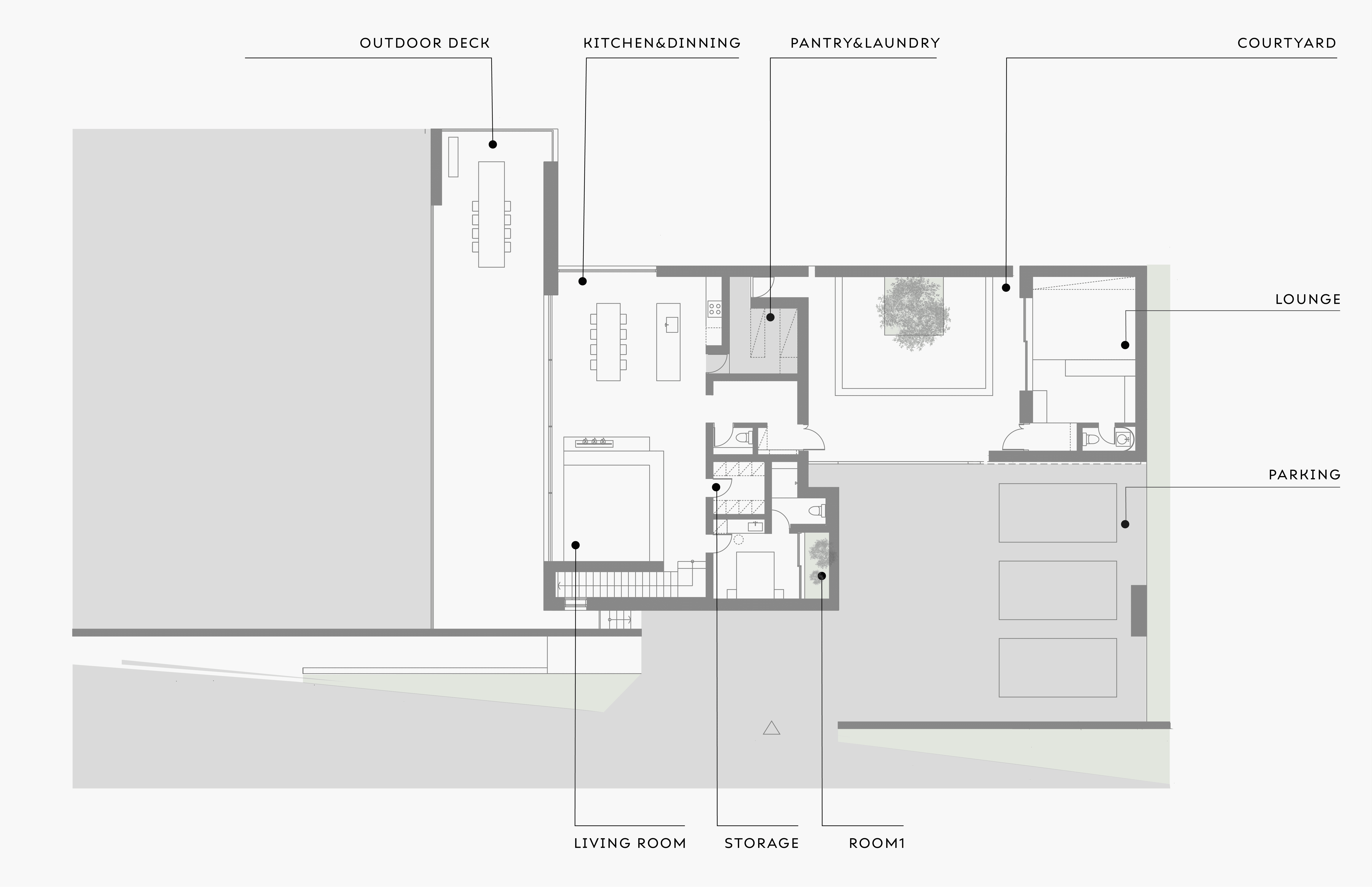 진입 마당과 주차장, 거실과 주방, 방 1, 테라스 / 별채 라운지