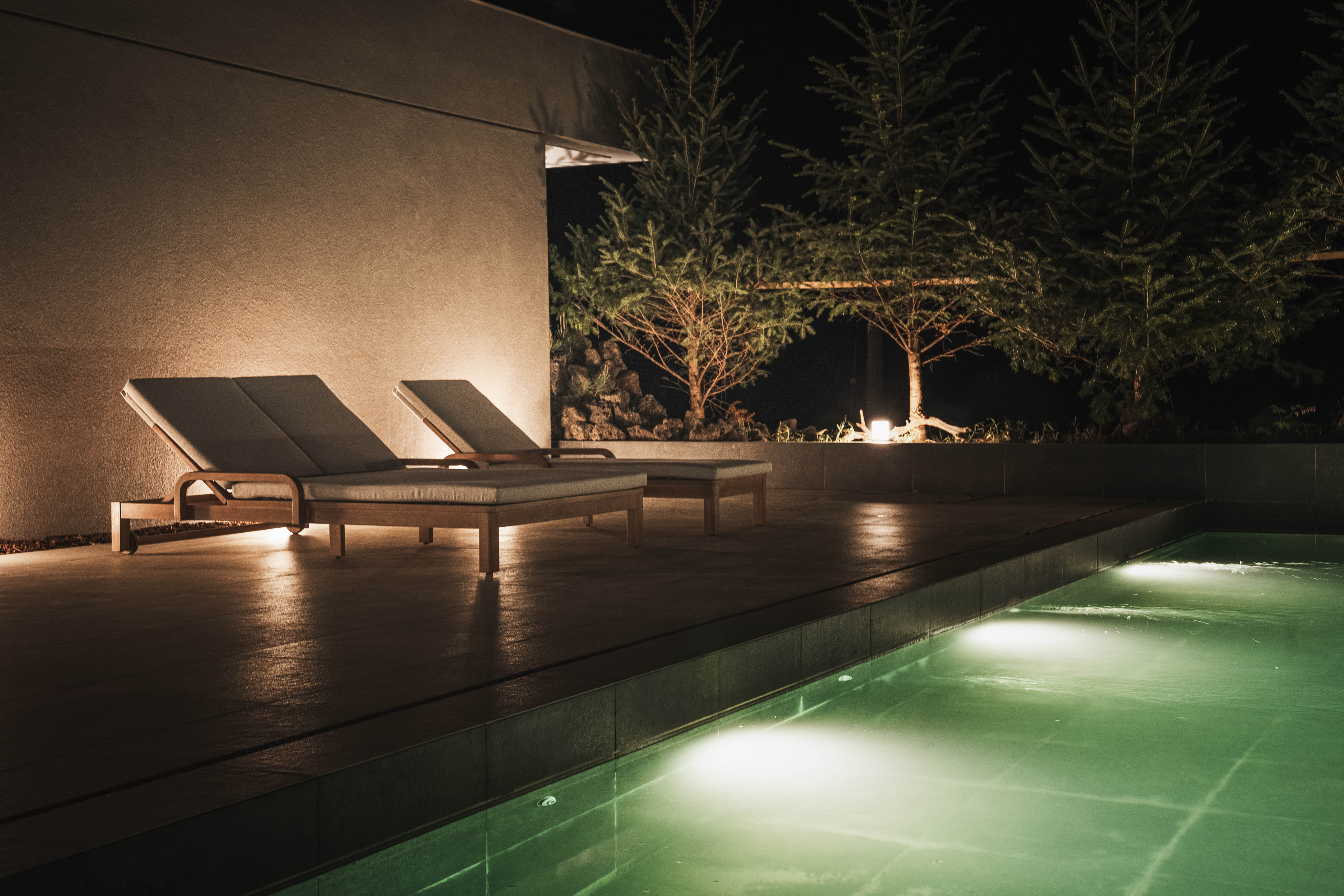 400평 대지에 130평 건축 공간을 최대 8명이 함께 숙박하며, 수영장, 야외 노천탕, 사우나, 별채 라운지 등을 즐길 수 있습니다.